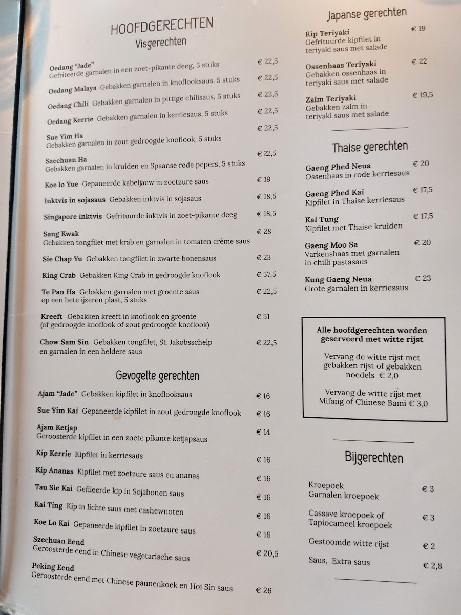 On the savory side, the menu is structured to satisfy both casual diners and those looking for more elaborate plates. Staples like Nasi and Mie Met Garnalen offer comfort and reliability, while starters such as Chinese Houd'euvre and Samengesteld Meer Dan Lekker Voorgerecht showcase variety and are ideal for sharing. The inclusion of Glas Rosé Met Kroepoek adds a playful, social touch, pairing drink and crunch in a way that fits well with the restaurant’s relaxed dining style.