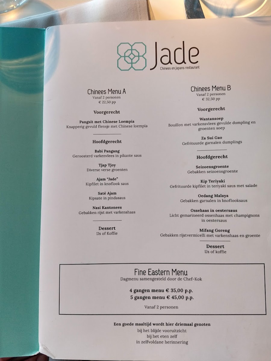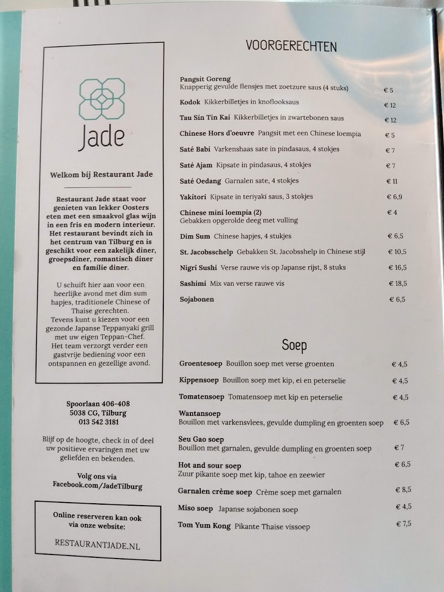 The menu at Jade Tilburg presents a confident blend of Asian classics and dessert-forward comfort, showing a kitchen that values variety and balance. The experience often begins gently with Frenchcoffee, setting a relaxed tone, before moving into playful sweets like Baked Banana, Tapioca with Mango Sorbet, and Tapioca Mango, which highlight a clear preference for tropical flavors and light textures. Desserts such as Sorbetijs Gebakken Banaan En Spekkoek feel indulgent yet familiar, rounding off meals with warmth and sweetness rather than heaviness.